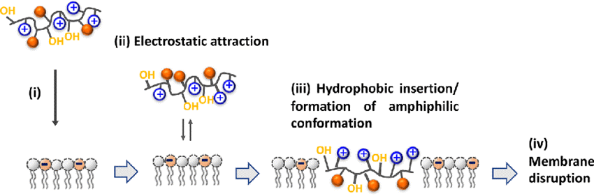 Well, it is known already that the membrane of the bacteria is negatively charged. Positively charged materials which are then applied, is causing the death of the bacteria. The caption below shows the way how it is done. Material and the membrane of the bacteria is creating the ionic bonding between each other, which allows the positively charged molecule to insert itself in the membrane and breaking it. Inside material of the bacteria (cytosol, plasmide…) leaks out, and leads to death of the bacteria.
